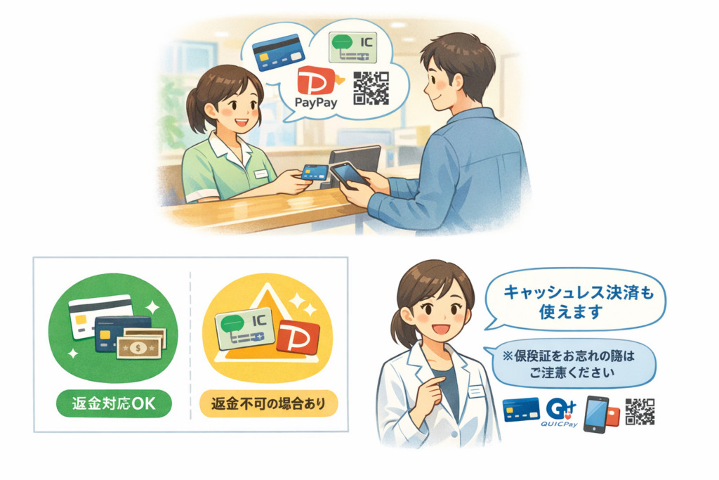 後日、保険証をご持参いただいた際に差額の返金手続きを行いますが、返金方法に制限があります。